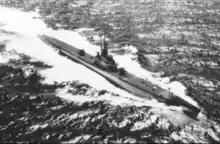 On the evening of 13 December 1944, while patrolling in darkness off the southern tip of French Indochina, Bergall sighted two Japanese warships — the heavy cruiser Myōkō and destroyer Ushio — moving away from her at 13 knots (24 km/h; 15 mph). She pursued them on the surface and, after slowly gaining ground for three hours, closed the range to 3,300 yards (3,000 m). Very shallow water forced her to make an attack on the surface. At 20:37 she fired six torpedoes at Myōkō and turned away. Three minutes later, a terrific explosion rocked Myōkō, producing an immense sheet of flame that reached at least 750 feet (230 m) into the air. As Ushio stopped to assist Myōkō, Bergall lurked nearby on the surface, planning to fire a salvo of torpedoes at her if given the opportunity. At 21:00, however, as Bergall maneuvered closer, Myōkō fired two shells at her. One landed in her wake close astern and the other, an 8-inch (203 mm) round, pierced Bergall′s forward loading hatch, tearing a large hole in her pressure hull but failing to explode.[6] Evading two more salvoes, Bergall cleared the area with alacrity.