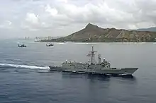Crommelin was decommissioned ahead of schedule at a ceremony in Pearl Harbor, 26 October 2012.[3] Crommelin's last contribution was as a SINKEX target ship during the major multi-nation naval exercise RIMPAC 2016. USS Coronado attempted to hit Crommelin with the first ever LCS-launched Harpoon surface-to-surface missile. However, the weapon missed. Crommelin succumbed to multiple hits from other SINKEX participants and sank later in the evening on 19 July 2016.[4] Her final resting place is approximately 23°00′N 159°55′W.[5]