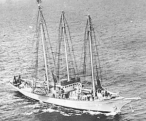 Guinevere was built for Edgar Palmer of New York who specified diesel electric propulsion for what was at the time the largest such yacht built in the United States and the largest fore and aft schooner yacht so far built worldwide.[2] The yacht's power plant consisted of two Winton six cylinder, 350 H.P. diesels directly connected to Westinghouse generators.[3] The generators provided power to a 555-horsepower Westinghouse motor directly coupled to the propeller.[4] Design was by A. Loring Swansey with the diesel electric design in cooperation with a Commander Fisher, USN.[2] The yacht was rated for a speed of 11.5 knots (13.2 mph; 21.3 km/h) under engines alone with 11,000 mile cruising range.[3] A two-ton refrigeration unit, two 15 kilowatt generators, bilge and other pumps, ventilation, power hoists, lights and radio were provided within the electrical system.[2] Batteries provided power at night when the power plant was shut down or in emergencies.[5] Guinevere was built by George Lawley & Son, of Neponset, Massachusetts, and launched April 21, 1921.[3][6][4]