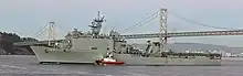 Following the Cyclone Nargis disaster in Burma in 2008, and during the following "Operation Caring Response" humanitarian aid mission to Burma, Harpers Ferry steamed in Burmese waters from 13 May to 5 June, waiting for the Burmese junta government to allow American aid to be taken to its citizens. During this operation, she was a part of USS Essex's expeditionary strike group, which also included Juneau and the guided missile destroyer Mustin,[1] However, in early June, with permission to enter Burmese airspace and land areas still not forthcoming from the Burmese government, it was decided to withdraw this aid mission and to return this Naval Task Group back to its previously-scheduled operations.[2]