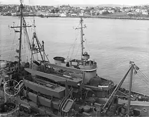 ![]() USS Lipan (ATF-85) moored outboard of USS Horace A. Bass (APD-124) at Mare Island Naval Shipyard, 8 April 1946. | |