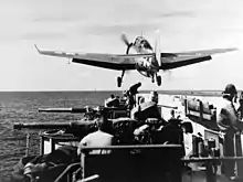 One 5 in (127 mm)/38 caliber dual purpose gun was mounted on the stern, and she was equipped with 16 Bofors 40 mm anti-aircraft (AA) guns in twin mounts, as well as 12 Oerlikon 20 mm cannons, which were used in an anti-aircraft capability.[4] By the end of the war, Casablanca-class carriers had been modified to carry thirty 20 mm cannons, as a response to increasing casualties due to kamikaze attacks. Anti-aircraft guns were mounted around the perimeter of the deck. Casablanca-class escort carriers were designed to carry 27 aircraft, but she sometimes went over or under this number. For example, during the Philippines campaign, she carried 15 FM-2 fighters, 9 TBM-3 torpedo bombers, and a TBM-3P photo reconnaissance plane, for a total of 25 aircraft.[5] However, during the Invasion of Iwo Jima, she carried 20 FM-2 fighters and 12 TBM-3 torpedo bombers, for a total of 32 aircraft.[2][6] During the Battle of Okinawa, she carried 16 FM-2 fighters and 11 TBM-3 torpedo bombers, for a total of 27 aircraft.[7]