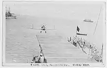 The keel for Mississippi was laid down on 5 April 1915 at the Newport News Shipbuilding Company of Newport News, Virginia. She was launched on 25 January 1917, and after completing fitting-out work, was commissioned into the US Navy on 18 December 1917. Then-Captain Joseph Lee Jayne served as the ship's first commanding officer. After completing sea trials off Virginia, Mississippi departed the United States on 22 March 1918 for the Gulf of Guacanayabo in Cuba, where she conducted further training.[5] From 1919 to 1921, William A. Moffett served as the ship's commander.[6] On 31 January 1919, she left for another round of training in the Caribbean.[5] Before the start of fleet maneuvers in March, Mississippi had a flying-off platform built atop her forward superfiring turret, and during the maneuvers that year, she operated a Hanriot HD.1. The ship launched the aircraft three times during the maneuvers, but as she had no landing facilities, the pilot had to land ashore and then be loaded back onto the platform.[7] Later in the year, she returned to Hampton Roads, Virginia, where she began a cruise between Boston and New York.[5]