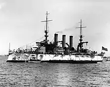 The keel for New Jersey was laid down at the Fore River Shipyard on 3 April 1902. She was launched on 10 November 1904; the daughter of Franklin Murphy, then the Governor of New Jersey, christened the ship. She was commissioned into the US fleet on 12 May 1906, Captain William Kimball in command.[2][3] New Jersey began her initial training in the Atlantic and Caribbean, which was interrupted by a naval review for President Theodore Roosevelt in Oyster Bay in September. On 21 September, the ship was deployed to Cuba to take part in the Second Occupation of Cuba; she remained there until 13 October. New Jersey participated in the Jamestown Exposition from 15 April to 14 May 1907,[3] which commemorated the 300th anniversary of the founding of the Jamestown colony. An international fleet that included British, French, German, Japanese, and Austro-Hungarian warships joined the US Navy at the event.[4]
