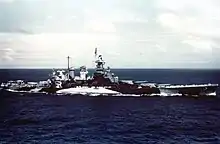 The ship was decommissioned on 27 June 1947 in New York and placed in reserve.[7] While she was out of service, the Navy considered several plans to modernize or convert the ship for other purposes. The first series of studies in 1954 revolved around improving the ship's speed to 31 knots (57 km/h; 36 mph), which would require a significant reduction in displacement and a much more powerful propulsion system. The displacement issue could be solved by the removal of the rear turret, but there was not enough room in the hull to place a power plant necessary to reach the desired speed. The Navy also evaluated a proposal to convert North Carolina into a helicopter carrier; the plan would have involved removing all of her main and secondary guns (though the forward turret would be retained to keep the ship balanced properly) in exchange for a flight deck and facilities for twenty-eight helicopters and a battery of sixteen 3-inch (76 mm) guns. The Navy ultimately decided that a new, purpose-built helicopter carrier would be cheaper and so the project was abandoned.[43]