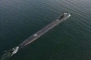USS North Dakota (SSN-784) is a Virginia-class nuclear powered attack submarine of the United States Navy. She is the second U.S. Navy vessel to be named for the U.S. state of North Dakota, the first being World War I-era battleship USS North Dakota (BB-29). The contract to build her was awarded to Electric Boat division of General Dynamics in Groton, Connecticut, on 14 August 2003. Her name was announced on 15 July 2008.[6] and her keel was laid down on 11 May 2012.[7] She was floated on 15 September 2013 and was christened on 2 November 2013, sponsored by Katie Fowler, wife of Vice Admiral Jeff Fowler.[8] She was commissioned in Groton, Connecticut, on 25 October 2014.
