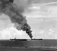 In the meantime, as the escort carriers conducted their strikes, the Japanese garrison on Suluan had managed to alert their command, triggering Admiral Soemu Toyoda to launch Shō-Gō 1, a gambit to defend Japan's access to the oil fields of Southeast Asia.[15] On 24 October, news began filtering through of the Japanese fleet moving out to engage, in what was to be the Battle of Leyte Gulf. Petrof Bay, having rejoined "Taffy 1" (Saginaw Bay had transferred her aircraft contingent to other carriers and retired from the field on 24 October), was located in the southernmost group of the escort carriers, just east of Surigao City. With this news, VC-76 began rearming into a complement more suitable to fighting against surface ships, with Captain Kane ordering all of her TBM Avengers to be loaded with torpedoes, of which they would dearly need the following day.[12][16]
