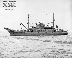 In August the ship was chosen to be the surface support vessel for the U.S. effort to recover the silver that the Philippine Treasury dumped in Manila Bay when the Japanese arrived on Corregidor.[1] U.S. Army and USN divers recovers millions of dollars of silver pesos on her decks into November 1945.