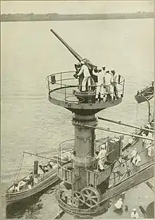 Upon her return to active duty with the fleet, Texas resumed a schedule alternating between training operations along the New England coast and off the Virginia Capes and winter fleet tactical and gunnery drills in the West Indies. That routine lasted just over two years until the February-to-March crisis over unrestricted submarine warfare catapulted the U.S. into World War I in April 1917. The 6 April declaration of war found Texas riding at anchor in the mouth of the York River with the other Atlantic Fleet battleships. She remained in the Virginia Capes–Hampton Roads vicinity until mid-August, conducting exercises and training Naval Armed Guard gun crews for service onboard merchant ships.[7] One of the gun crews trained aboard Texas was assigned to the merchant vessel Mongolia at the beginning of the war. On 19 April, the crew of Mongolia sighted a surfaced German U-boat and the gun crew trained aboard Texas opened fire on the U-boat, averting an attack on Mongolia and firing the first American shots of World War I.[28]