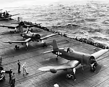 Upon taking on board the cargo required to sustain her replenishment duties, Windham Bay took to sea, as a part of Task Unit 50.8.4, the CVE Plane Transport Unit, along with her sister ships Admiralty Islands, Bougainville, and Attu. As a part of Task Group 50.8, the Logistics Support Group, the replenishment carriers were under the command of Rear Admiral Donald B. Beary. En route, the carriers were screened by the destroyer escorts Greiner, Sanders, and Wyman.[8] She arrived off Iwo Jima on 19 February, whereupon she began delivering replacement aircraft and crews to the fleet carriers conducting operations over the island, with the transferring aircraft being screened by the fighter contingents of Makassar Strait and Shamrock Bay. Task Unit 50.8.4 first conducted deliveries to Task Groups 58.1, 58.4, and 58.5 on 19 February, conducted deliveries to Task Groups 58.2 and 58.3 the following day, and then deliveries to all the Task Groups excepting 58.5 on 21 February. Her main duties finished, Windham Bay continued delivering a trickle of planes until 1 March, when her Task Group returned to replenish at Ulithi. In total, the four escort carriers had delivered 254 aircraft and 65 plane crews to the fleet carriers, the majority of which were transferred on the first three days.[9][7]