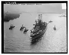 On 14 October, New York collided with a U-boat and sank it. The collision nevertheless damaged her screws, which forced Rodman to transfer his flag from New York to Wyoming while the former was in dock for repair.[7] On 21 November, after the Armistice with Germany ended the war, Wyoming and an Allied fleet of some 370 warships met the High Seas Fleet in the North Sea and escorted it into internment in Scapa Flow.[2][8] On 12 December, Wyoming, now the flagship of Rear Admiral William Sims, the new BatDiv 9 commander, left Britain for France. There, she rendezvoused off Brest, France, with George Washington, which was carrying President Woodrow Wilson to the peace negotiations in Paris. Wyoming then returned to Britain two days later before departing for the US, arriving in New York on 25 December. She remained there through the new year, and on 18 January 1919, she became the flagship of BatDiv 7, flying the flag of Rear Admiral Robert Coontz.[2]