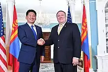 The Prime Minister's visit to the United States of America in September 2018 elevated the cooperation levels between the two countries to expanded comprehensive partnership.[19] This paved the way for Mongolia and the US to become strategic partners a year later.[20] During the historic visit Khürelsükh met the Secretary of State Michael Pompeo to ink the $350 million Millennium Challenge Corporation Mongolia Water Compact.[21]