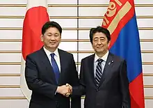 He has also served as a mediator between Japan and North Korea.[22] Khürelsükh made an official visit to Japan in December 2018 and met Prime Minister Shinzo Abe to reiterate close bilateral cooperation as part of a Japan-Mongolia Summit Meeting. Following the summit meeting the signing of the “Memorandum of Cooperation Between the Ministry of the Environment of Japan and the Ministry of Environment and Tourism of Mongolia on Environmental Cooperation” took place in the presence of the two leaders, and a Japan-Mongolia joint statement and fact sheet for the “Japan-Mongolia Mid-term Action Plan for a Strategic Partnership” were also issued.[23] The two sides also discussed about the New Ulaanbaatar International Airport.
