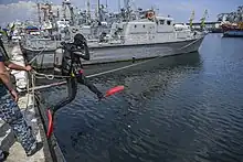Taking part in the Sea Breeze 2017 exercise on the night of 18/19 July, the boat was playing a role of emergency ship during a tactical exercise.[20] The next day, Skadovsk, commanded by Starshy michman Dus, was patrolling the Danube when the ship ran aground at a speed of 18 knots (33 km/h; 21 mph) resulting in ₴ 1,350,000 in damages.[21] Dus was charged with Article 417, violation of rules of navigation of the Criminal Code of Ukraine[22][23] On 24 October 2017 the Ukrainian Navy Command contracted the Southern Shipbuilding Company to make repairs to boats hull to fix multiple holes and cracks. Repairs were planned to finish by 24 November of the same year and cost ₴ 2,099,000.[19] By 12 December 2017 boat was repaired at Mykolayiv shipyard of the Smart Maritime Group jointly with the Southern Shipbuilding Company.[24]