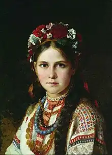 Ukrainian wreath (Ukrainian: вінок, vinók), or Vinok, is a type of wreath which, in traditional Ukrainian culture, is worn by girls and young unmarried women. The wreath may be part of a tradition dating back to the old East Slavic customs that predate the Christianization of Rus.[1] The flower wreath remains a part of the Ukrainian national attire, and is worn on festive occasions and on holy days, and since the 2014 Ukrainian revolution increasingly in daily life as part of a wider cultural revival.[2][3]