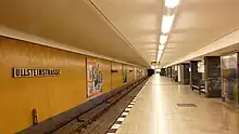 Rümmler designed a 110 meter long and almost nine meter wide central platform with two entrances. The design is similar to the contemporary metro station Möckernbrücke on the U7 line: The walls behind the tracks are tiled in yellow, the supporting pillars and the wall under the bridge, which divides the platform almost the entire length, are covered with dark basalt . The floor received bright ceramic tiles, A special feature was also the public address system: Instead of many distributed speakers, the station had a single track-long sound pipe, which had only one central speaker. The sound could escape through numerous small openings above the platform. Meanwhile, the station has a normal public address system.