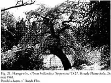 The journal Nature reported in July 1918 "a remarkable elm of the variety known as Ulmus serpentina, apparently about sixty years old, vigorously growing in a Croydon garden".[22] "Sixty years old" would pre-date the first known reference to a 'Serpentina', but would tally with an early 'Camperdownii' planting. Späth's U. montana serpentina was planted at Kew in 1896. Henry, though he describes Kew's 'Serpentina', calling it "U. major var. serpentina Henry", makes, unusually, no mention of a Kew 'Camperdownii'. Späth's U. montana serpentina was planted in 1897 at the Dominion Arboretum, Ottawa, Canada, which, though it contained some eighty elm cultivars by the turn of the century, had no specimen labelled 'Camperdownii'.[24] Three specimens supplied by the Späth nursery to the Royal Botanic Garden Edinburgh in 1902 as U. montana serpentina (see 'External links' below) are now assumed by the Garden to have been 'Camperdownii',[25] the Garden having no separate accession record for its 'Camperdownii', a sizeable tree by the 1970s (felled in the 1980s).[26] A specimen of U. montana serpentina obtained from Späth before 1914, and planted in 1916, stood in the Ryston Hall arboretum, Norfolk,[27] in the early 20th century.[28] A 1920 photograph taken at Hortus Botanicus, Leiden, showing a weeping tree, is captioned Ulmus scabra [: U. glabra Huds.] Serpentina.[29] Its identification by the arboretum as a wych cultivar points to Camperdown Elm.