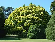 Before Dutch elm disease the tree was commonly cultivated in northern Europe.[7][8] The Späth nursery of Berlin marketed it in the late 19th century as U. campestris Louis van Houtte,[9] under which name it was introduced to the Dominion Arboretum, Ottawa, Canada, in 1898,[10] and to the Ryston Hall arboretum, Norfolk, UK,[11] (planted 1913).[12] In the UK the tree was supplied by Hillier & Sons Nursery of Winchester, Hampshire, as U. procera 'Vanhouttei' / 'Louis van Houtte'.[13] The tree appeared in the 1902 catalogue of the Bobbink and Atkins nursery, Rutherford, New Jersey, as Ulmus aurea Louis van Houtte,[14] and in Kelsey's 1904 catalogue, New York, as U. 'Louis van Houtte'.[15] It is less commonly cultivated in Australasia, where the golden wych elm Ulmus glabra 'Lutescens' has sometimes been mistakenly sold by nurseries under the name 'Louis van Houtte'.[16] The description, "The finest of the golden elms, with a large leaf of a clear golden colour", in the 1918 catalogue of the Gembrook or Nobelius Nursery near Melbourne, suggests 'Lutescens' rather than 'Louis van Houtte'.[17] Three trees in separate locations are known in the British Isles,[note 1] as well as a partial avenue in Aberdeen (see 'Notable trees').[18] The cultivar remains in commerce at a nursery in the US.