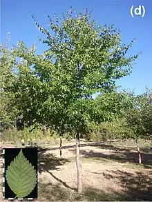 'Toledo' grew at a comparatively fast rate of 89 cm per annum in the trials at Puerta de Hierro, Madrid. The erect branches form an irregular crown and are devoid of corky tissue. The leaves, on 6 mm petioles, are ovate, typically acuminate at the apex, the average length and width 47 × 27 mm, the margins doubly serrate. Foliar density relative to 'Sapporo Autumn Gold' is described as 'high'. In the Madrid study, the appearance of the tree was rated 2.9 / 5. [1] The leaves flush in early April (week 14) in southern England.