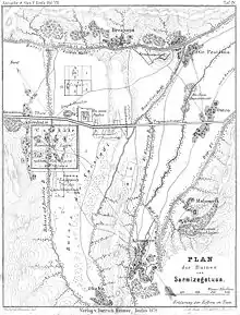 The settlement was built at a distance of 8 km from Tapae, a pass between Banat and Transylvania (today known as the Iron Gates of Transylvania). The choice was based on the military and economic advantages given by the natural barrier represented by the Retezat Mountains in the south and Poiana Ruscă Mountains in the north. The territory of the metropolis extended from Tibiscum to Micia and to the Jiu valley, the city being protected by several castra: Tibiscum, Pons Augusti, Micia and castra of Bumbești.[8]