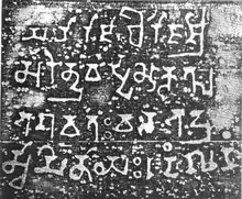 The Umachal rock inscription is one of the earliest epigraphic sources discovered in Assam. Dated to the 5th century, the rock description was discovered in the north-eastern slopes of the Nilachal Hills (called Umachal), near Guwahati city.[1] The artifact is dated primarily on the basis of the identification of the named Surendravarman with Mahendravarman (fl. c470-494) of the Varman dynasty.[2] The script is in the Nagari variety of the Gupta script and the language is Sanskrit prose.[3] Though the Nilachal Hills is known for the Kamakhya Temple, a shakta/tantra site, this temple was for Balabhadra, a god of the Vaishnavite pantheon.[4]