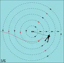 The general procedure is to start from a fixed central point, and to search the circumference of a circle where the radius is defined by a search line anchored at the central point. The radius of the circle is dependent on visibility, and is increased after each circle has been completed, by an amount which allows the diver to either see or feel an overlap between the current arc and the previous arc.[2][3]