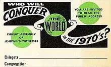 Talks at congregation meetings and assemblies also disseminated the prophecy. Speakers at some conventions highlighted the phrase "Stay alive till '75" and urged the audience to maintain their meeting attendance or risk losing their lives at Armageddon.[50] The Dutch branch overseer urged the audience at a "Divine Purpose" district convention in 1974 to "pioneer" (take part in full-time preaching) as the end approached: