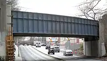 Prior to the construction of Grand Central Parkway and Interboro Parkway (now the Jackie Robinson Parkway) in the 1930s,[12] Union Turnpike was heavily used, and developed businesses throughout its length. In 1929, there was a proposal to make improvements to four existing roads in order to make them major thoroughfares between Queens and Nassau, namely Astoria Boulevard, Northern Boulevard, Nassau Boulevard, and Union Turnpike.[13] Civic associations in Jamaica opposed the Union Turnpike proposal, and they convinced Queens Borough President George Harvey.[14] Nevertheless, the section of Union Turnpike from Kew Gardens to the Nassau County line was converted from a narrow unpaved road to a paved multi-lane highway in the late 1930s, in advance of the 1939 New York World's Fair.[15] Around the same time, the turnpike was depressed below Queens Boulevard in conjunction with the construction of the Queens Boulevard Subway, and extended eastward from Fresh Meadows towards Marcus Avenue in Nassau County.[4][16]