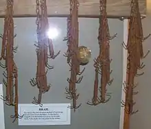 The need to "catch" freshwater mussels for the "pearl" button industry spurred the invention of tools to make the job easier than "pollywogging" with bare feet. In 1897 inventive mussel fishermen bent steel bars into wide open hooks which they called "brail hooks" or "crow foots" and used them to try to catch or trap the freshwater mussels. The process was simple: several of these "brail hooks" were attached to a long wooden bar with lengths of rope and the entire assembly was lowered into the river and dragged behind a boat along the river bottom. When the tips of these hooks came in contact with an "open" freshwater mussel, the mussel clamped its valves shut around the hooks and could be lifted from the bottom. Within a short period of time millions of freshwater mussels were collected in this manner.[13][14][15]