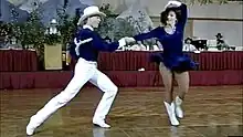 In couples competition, one partner, generally a male, is the "lead" and the other, generally a female, the "follow". Leads wear a number pinned to their back. The number allows the judges to assign judging scores to the appropriate competitive couple.[35][36] In UCWDC couples competition, dancers compete at a dance level commensurate with their skill abilities and/or qualifications.[37]