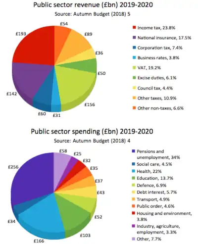 Like education, there is a universal right to "health and well-being" including "medical care and necessary social services".[30] The National Health Service, founded in 1946, has consistently been seen as one of the most important aspects of the UK's constitution,[31] and goes considerably beyond international human rights standards. Its founding principle, that everyone should receive health care free, as a right, is usually seen as politically "untouchable", and is consistently rated as the UK's most popular institution.[32] However, the details of funding and governing health have been volatile and contested. The UK has among the world's highest life expectancy (82.8 years in 2015), but spends a relatively low amount of money on its service (9.7 per cent of GDP in 2016).[33] Since the Health and Social Care Act 2012 changed its governance, health care expenditure rose dramatically without visible health gains.[34] The National Health Service is funded directly by the UK Treasury from general taxation, which requires no citizen to buy insurance, or pay upfront costs (except for capped, and means tested prescription charges for medicines, dental and optical service in England.[35] Scotland, Wales or Northern Ireland scrapped prescription charges).[36] According to the NHS Constitution for England art 1(2), "Access to NHS services is based on clinical need, not an individual’s ability to pay".[37] Health care is a devolved matter, but each country of the UK organised its health system following the model in the proposals of the landmark Beveridge Report of 1942.[38] The Beveridge model of health provision, common to countries like Denmark, Sweden or Greece, removed the requirement of contributions by workers under the National Insurance Act 1911.[39] Insurance systems continue in countries like France, Germany,[40] or the United States.[41] As the UK government bears the cost of health care, and the potential to profit from people being ill is eliminated, the government has a strong incentive to improve public health with measures like the Public Health Act 1961, the Health and Safety at Work Act 1974, or the Environmental Protection Act 1990.