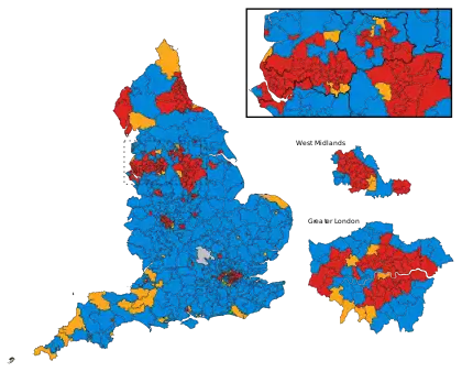 ![]() A map of English parliamentary constituencies *Seat figure does not include the Speaker of the House of Commons, John Bercow, who was included in the Conservative seat total by some media outlets. †Owing to electoral boundaries changing, this figure is notional. | |||||||||||||||||||||||||||||||||||||||||||||
