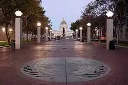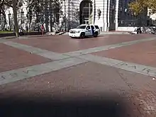 ![]() UN Plaza features the emblem of the United Nations and a view of San Francisco City Hall, looking west (2010) | |
