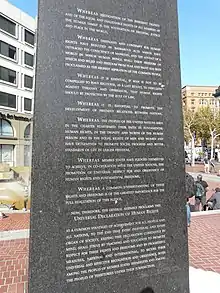 In 1995, for the 50th anniversary of the United Nations, a "Walk of Great Ideas", funded with private donations, was added to the plaza at a cost of US$400,000 (equivalent to $770,000 in 2022).[18] The Walk consisted of eight white granite paving stones inlaid with the preamble to the UN Charter in brass, matching the style of the coordinates cross in the southwest part of the plaza.[5]: 4–81 Additional updates in 1995 included inscribing a list of UN member nations on the light standards, adding the UN emblem to the center of the plaza, engraving the preamble to the Universal Declaration of Human Rights on an existing 17-foot (5.2 m) tall black granite obelisk, and updating the lighting fixtures.[11][18][19] The original luminaires were semi-translucent and square, matching the shape of the columns; the updated fixtures (which remain today) are frosted glass globes.[5]: 5–33