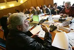 On 20 September 2003, the Third Party Congress adopted the election program and approved the list of candidates for the elections.[54] The congress was welcomed by Vladimir Putin, who wished the party success in the elections.[55] On 7 December, the party "Unity and Fatherland - United Russia" won the elections, receiving 37.57% of the vote, and with single-mandate members, a constitutional majority in the State Duma. Boris Gryzlov became speaker of the State Duma.
