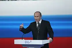 United Russia supports the policies of the incumbent President of Russia, Vladimir Putin, who previously served as party leader during the presidency of Dmitry Medvedev; despite not currently being the official leader or a member of the party, Putin operates as its de facto leader.[24] The party peaked in the 2007 Russian legislative election with 64.3% of the vote, while in recent years, it has seen its popularity decline.[25] The party's ideology has been inconsistent but embraces specific politicians and officials[26] who hold various political views but support Putin.[27] The party appeals mainly to pro-Putin and non-ideological voters[28][29] and is often classified by political scientists as a "big-tent party"[30][31][32][33] or as a "party of power",[34][35][36][37][38][39] meaning that it is the most influential Russian political force that makes major political decisions. In 2009, it proclaimed Russian conservatism as its official ideology.[5][40]