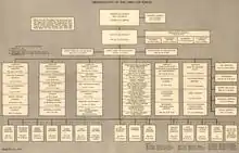 The Circular No. 59 reorganization directed the AAF to operate under a complex division of administrative control performed by a policy staff, an operating staff, and the support commands (formerly "field activities" of the OCAC). The former field activities operated under a "bureau" structure, with both policy and operating functions vested in staff-type officers who often exercised command and policy authority without responsibility for results, a system held over from the Air Corps years. The concept of an "operating staff", or directorates, was modeled on the RAF system that had been much admired by the observer groups sent over in 1941, and resulted from a desire to place experts in various aspects of military aviation into key positions of implementation. However functions often overlapped, communication and coordination between the divisions failed or was ignored, policy prerogatives were usurped by the directorates, and they became overburdened with detail, all contributing to the diversion of the directorates from their original purpose. The system of directorates in particular handicapped the developing operational training program (see Combat units below), preventing establishment of an OTU command and having a tendency to micromanage because of the lack of centralized control.[29] Four main directorates—Military Requirements, Technical Services, Personnel, and Management Control—were created, each with multiple sub-directorates, and eventually more than thirty offices were authorized to issue orders in the name of the commanding general.[30]