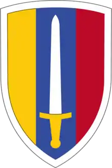 Yellow and red are the colors of Vietnam. The blue center represents the United States, together with the sword it alludes to the U.S. Military in Vietnam.