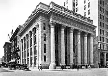 The United States National Bank of Portland, the predecessor of present-day U.S. Bancorp, was established in Portland in 1890, opening for business in February 1891.[10] During the following three decades, the bank experienced significant growth. It weathered the Panic of 1893 better than many of its competitors, and later acquired some of the competing Portland banks, including the Ainsworth National Bank (in 1902), the Wells Fargo Bank (in 1905), and the Lumbermen's National Bank (in 1917). With the 1902 acquisition, U.S. National Bank moved its headquarters into a larger space formerly occupied by Ainsworth National, in the Ainsworth Building, then located at S.W. Third and Stark streets in downtown Portland.[11] By the 1910s, the bank had outgrown its space. The firm purchased a quarter-block of land at the northwest corner of Sixth and Stark streets in early 1916 and hired Portland architect A. E. Doyle to design a new, dedicated headquarters building.[12]