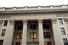 The United States National Bank Building in downtown Portland, Oregon was designed by A. E. Doyle in a Roman classical style,[2] and is listed on the National Register of Historic Places.[5] The four-story building's first section, facing Sixth Avenue, was completed and opened in 1917. The building features a four-story Corinthian colonnade at its eastern end (originally the principal façade) and makes extensive use of glazed terracotta. The interior is also decorated extensively with highly textured materials.
