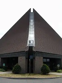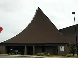![]() Side view of building shows its ski jump shape | |