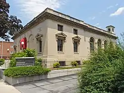 Designed by Office of the Supervising Architect James Knox Taylor in 1910 and built between 1911 and 1913, this historic structure is a sandstone building that was created in the Renaissance Revival style. It consists of a five-bay by two-bay front section with a low hipped roof, and a four bay rear extension. The front facade features a trio of arches flanked by rectangular windows at either end. The post office closed in 1969, after which the building was occupied by a clothing store("Trone & Weikert") until being renovated for offices in 1991.[2]