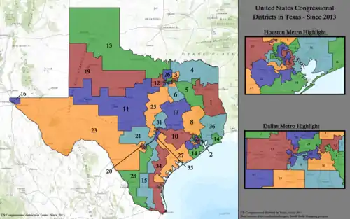 Below is a table of United States congressional district boundary maps for the State of Texas, presented chronologically.[4] All 10 redistricting events that took place in Texas in the decades between 1973 and 2013 are illustrated here.