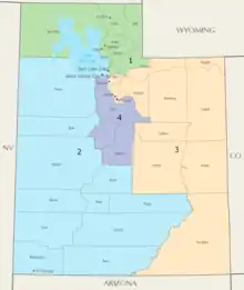 Members of the House of Representatives are elected every two years by popular vote within a congressional district.[15] From 1895 till 1913, Utah had an at-large congressional district that represented the entire state. Every ten years, the number of congressional districts is reapportioned based on the state's population as determined by the United States census;[16] Utah has had four districts since 2013.