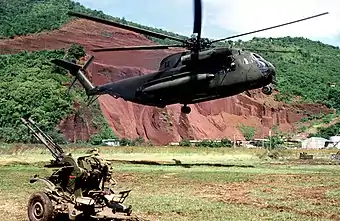![]() An American Sikorsky CH-53 Sea Stallion helicopter hovers above the ground near an abandoned Soviet ZU-23-2 anti-aircraft weapon during the American invasion of Grenada, 1983. | |||||||