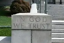 The modern motto of the United States of America, as established in a 1956 law signed by President Dwight D. Eisenhower, is "In God we trust".[1][2][3] The phrase first appeared on U.S. coins in 1864.[2]