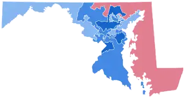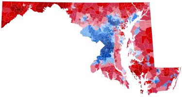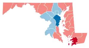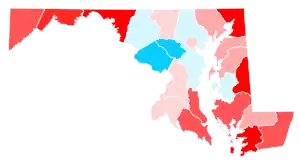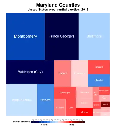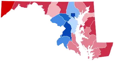 Clinton won Maryland with 60.3% of the vote, while Trump received 33.9%.[3] Maryland was among the eleven states (and the District of Columbia) in which Clinton improved on Barack Obama's 2012 raw vote total, although by just 84 votes.[4] Maryland was one of four states in which Clinton received over 60% of the vote, the others being Massachusetts, Hawaii, and California. However, Maryland was the only one of those eleven states to have voted more Democratic in both 2012 and 2016. In this election, Maryland voted 24.32% to the left of the nation at-large.[5]