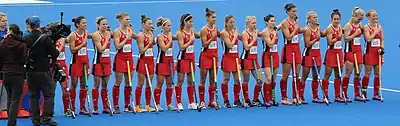 The United States women's national field hockey team,[2][3] represents the United States in international field hockey. The team is currently coached by David Passmore.[4] It made its first international appearance in 1920 when a touring team visited England, coached by Constance M.K. Applebee. The team made several international appearances in the early 20th century, leading to the United States hosting the eighth International Federation of Women's Hockey Associations Tournament in 1963. Once the IFWHA merged with its counterpart on the men's side, the United States' first appearance at an FIH-sanctioned tournament was the 1983 Women's Hockey World Cup in Kuala Lumpur, Malaysia, where the Americans ended up in sixth place. They have won bronze at the Los Angeles 1984 Summer Olympics and bronze at the 1994 World Cup.[5][6]