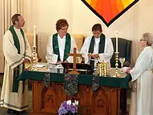 MCC bases its theology on the historic creeds of the Christian Church, such as Apostles' and Nicene creeds. Every church is required to celebrate the Eucharist at least once a week, and to practice open communion, meaning that recipients need not be a member of the MCC or any other church to receive the Eucharist. Beyond that MCC allows its member churches independence in doctrine, practice, and worship as worship styles vary from church to church. The MCC is considered to be Bible-based[10] and many pastors take a fundamentalist approach to scripture.[11]