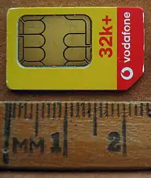 The universal integrated circuit card (UICC) is the smart card (integrated circuit card) used in mobile terminals in 2G (GSM) , 3G (UMTS), 4G (LTE), and 5G networks. The UICC ensures the integrity and security of all kinds of personal data, and it typically holds a few hundred kilobytes.[1] The official definition for UICC is found in ETSI TR 102 216, where it is defined as a "smart card that conforms to the specifications written and maintained by the ETSI Smart Card Platform project". In addition, the definition has a note that states that "UICC is neither an abbreviation nor an acronym".[2] NIST SP 800-101 Rev. 1 and NIST Computer Security Resource Center Glossary state that, "A UICC may be referred to as a SIM, USIM, RUIM or CSIM, and is used interchangeably with those terms",[3][4] though this is an over-simplification. The primary component of a UICC is a SIM card.